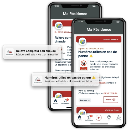 La maintenance d’un ascenseur ? Une coupure d’eau chaude ? Un rappel d’échéance ? MA RÉSIDENCE c’est toute l’information essentielle directement dans la poche de vos occupants.