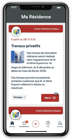 "Avant on passait trop de temps à faire des affiches ! Aujourd’hui tous les occupants ce sont abonnés à l’application : ils reçoivent les informations directement sur leur smartphone ! La solution est très appréciée et bien plus efficace que le patchwork d’affiches dans l’entrée."